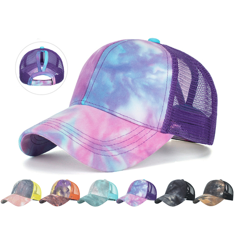 Sombreros de Golf con logo teñido de corbata de alta calidad para mujer con cola de caballo poliéster personalizado 6 paneles ala curva gorras de camionero de béisbol