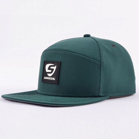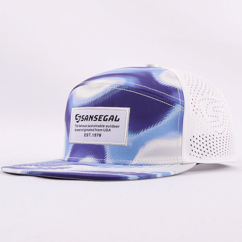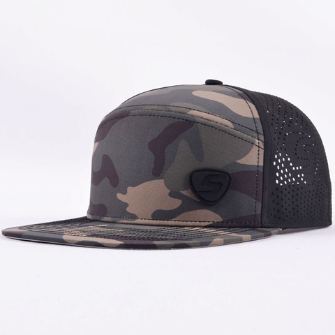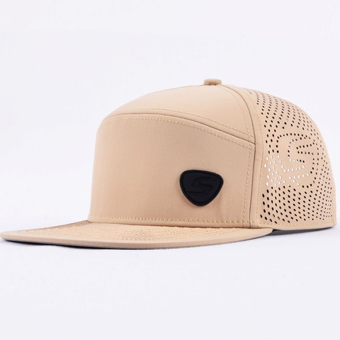 Oem Custom 7 Panel Flat Bill Heren Snapback Hoed Prestatie Rubber Patch Logo Cap Polyester Laser Gesneden Gat Sportkap