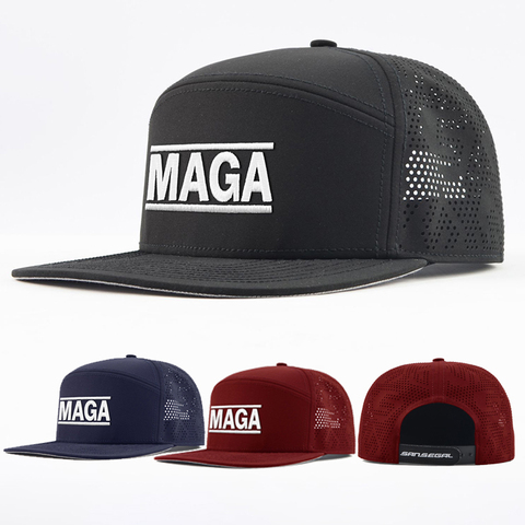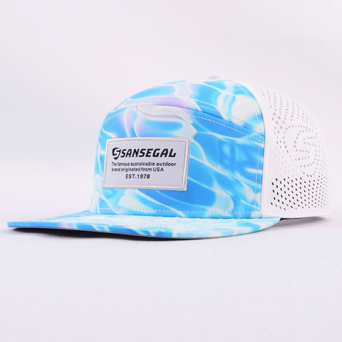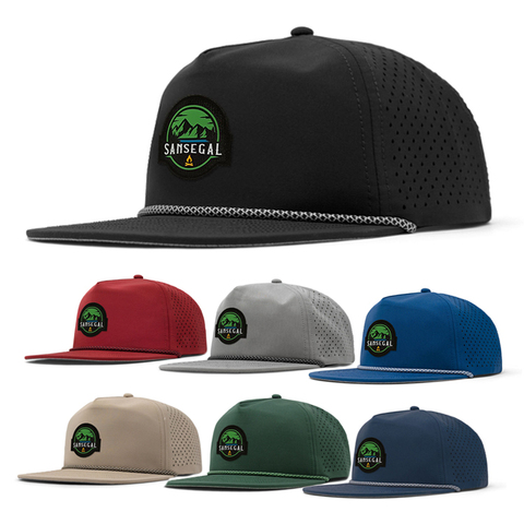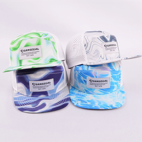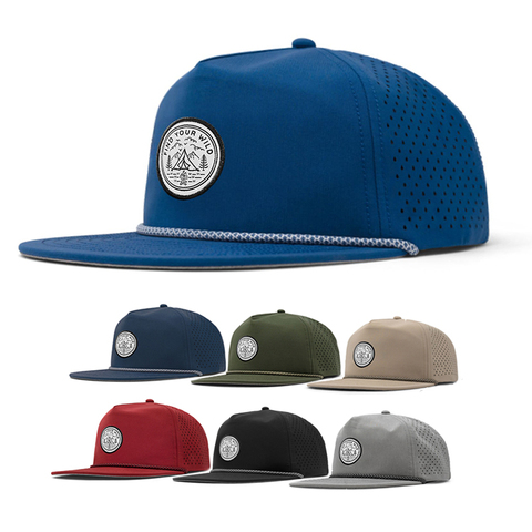 Custom Borduurwerk Patch Logo Waterdichte 5 Panel Verstelbare Snapback Sport Caps Laser Gesneden Gat Platte Bill Snapback Hoed